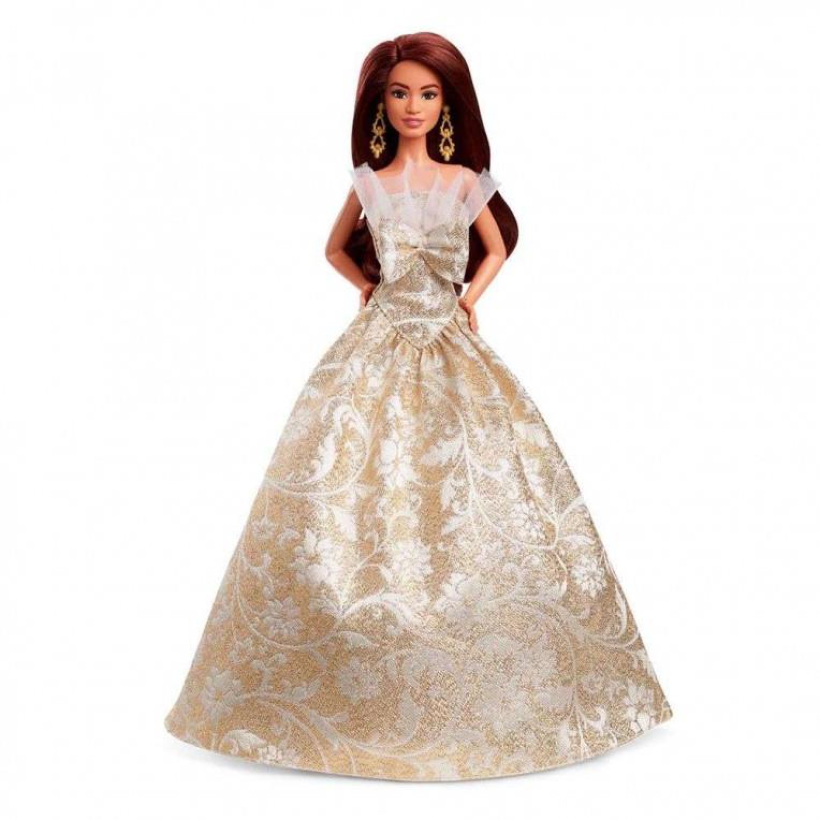Barbie'nin görkemli elbisesini altın rengi damla küpeler ve ışıltılı altın rengi topuklu ayakkabılar tamamlar.