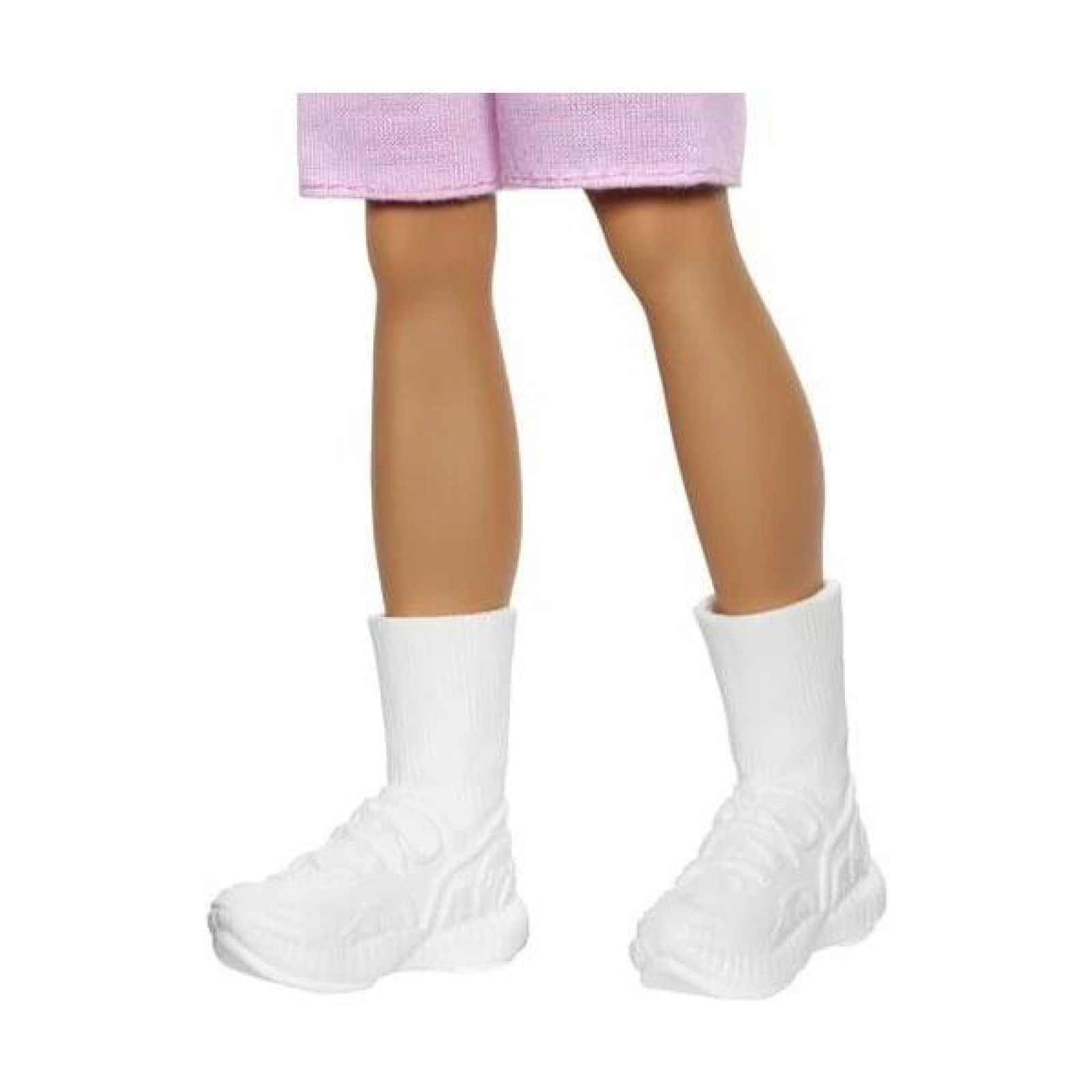Sarışın Saçlı Barbie Fashionistas Ken Bebek, Pembe Şort, Beyaz Çorap ve Spor Ayakkabı ile Kırmızı Beyaz Çizgili Polo Tişört Giyiyor.