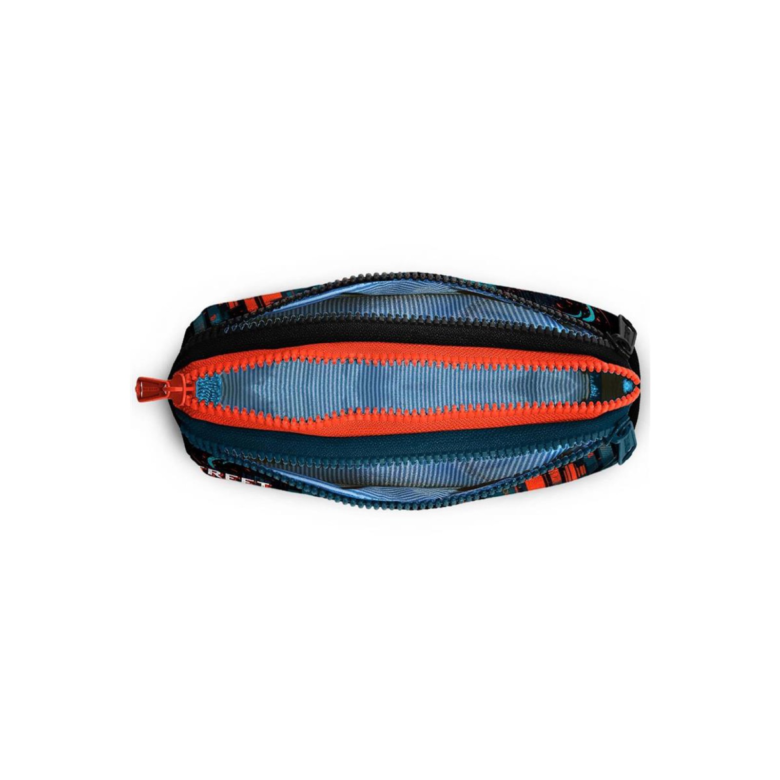Üç bölmeli, fermuarlı kalem çantası.