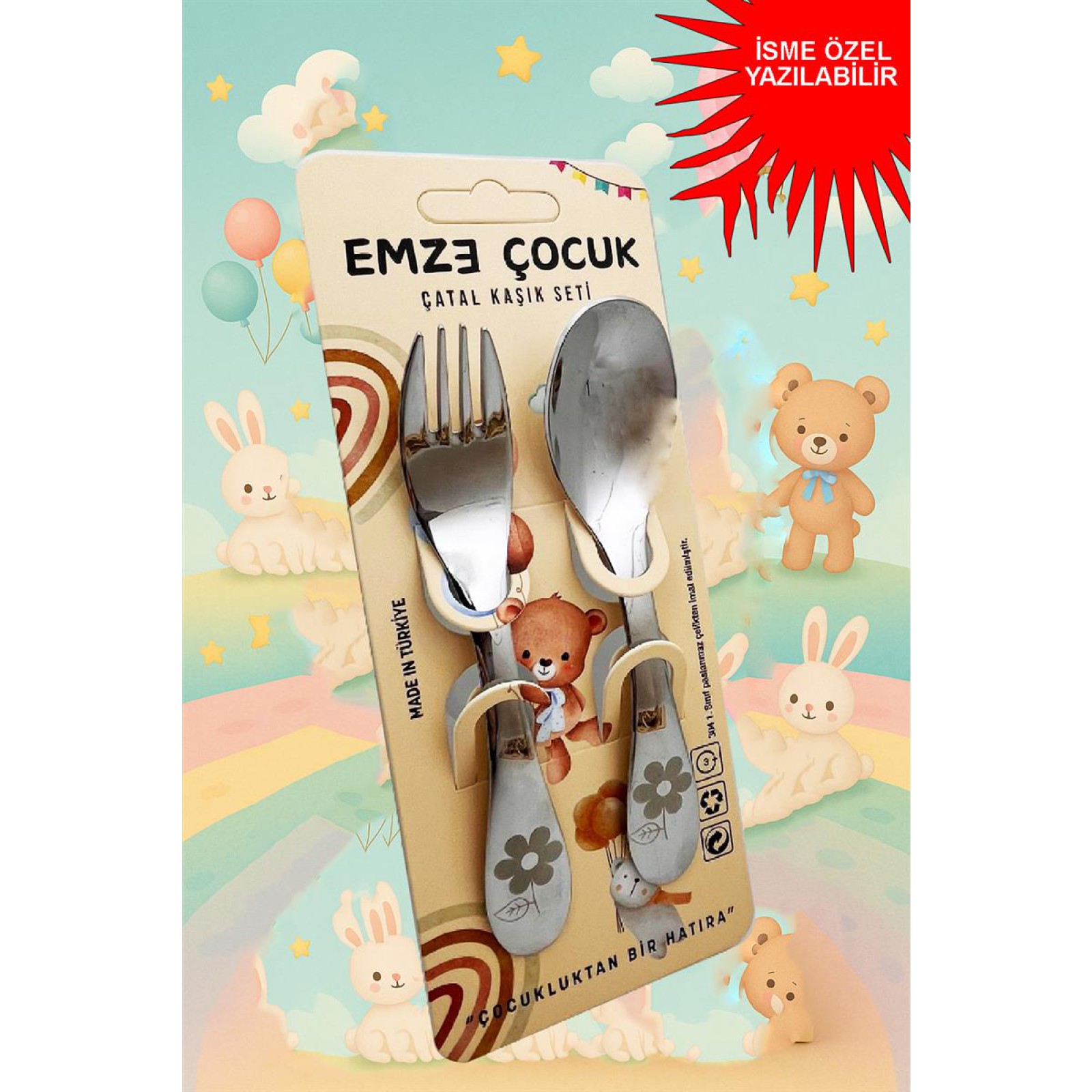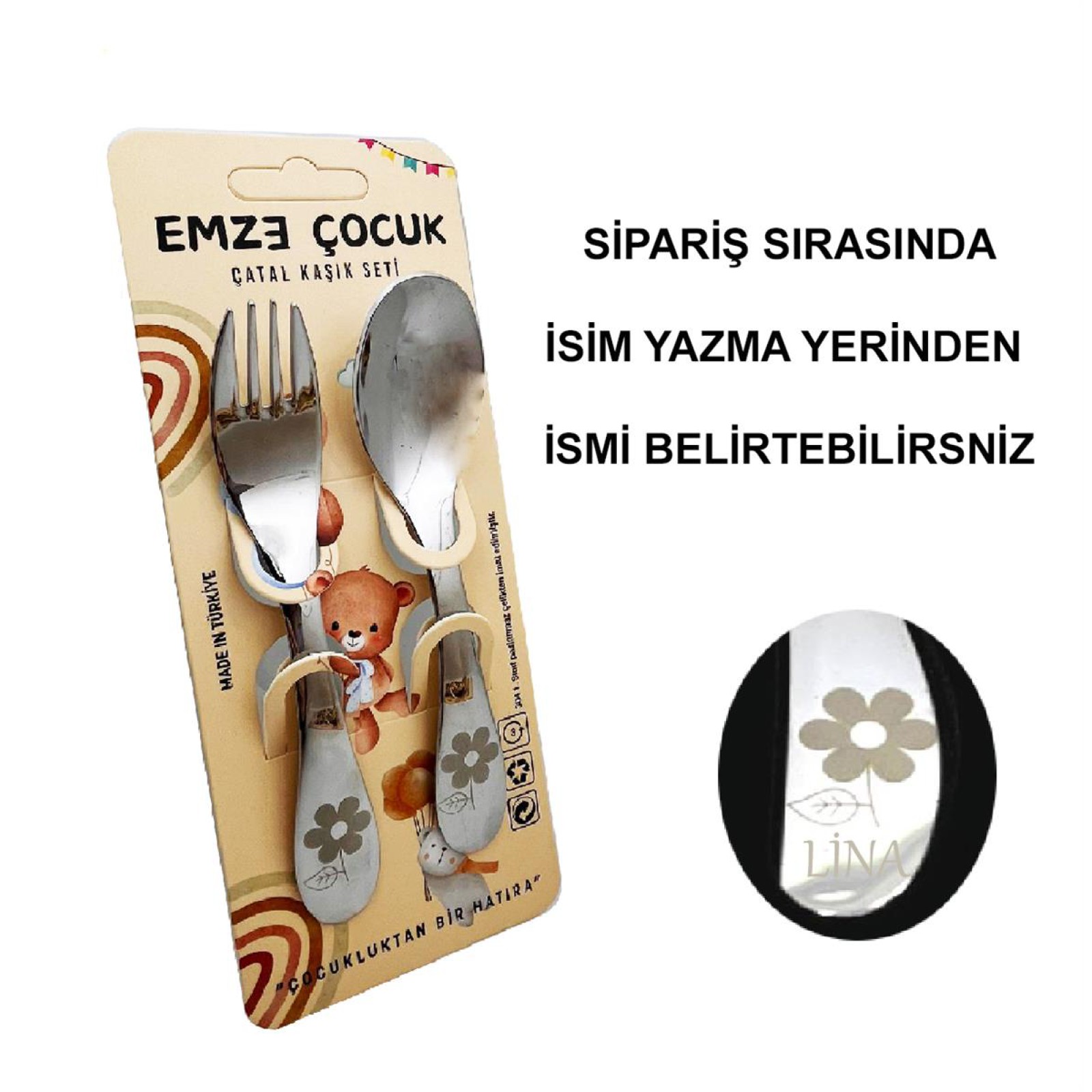 Emze Çocuk Paslanmaz Çelik Çatal Kaşık Seti Çiçek Desenli