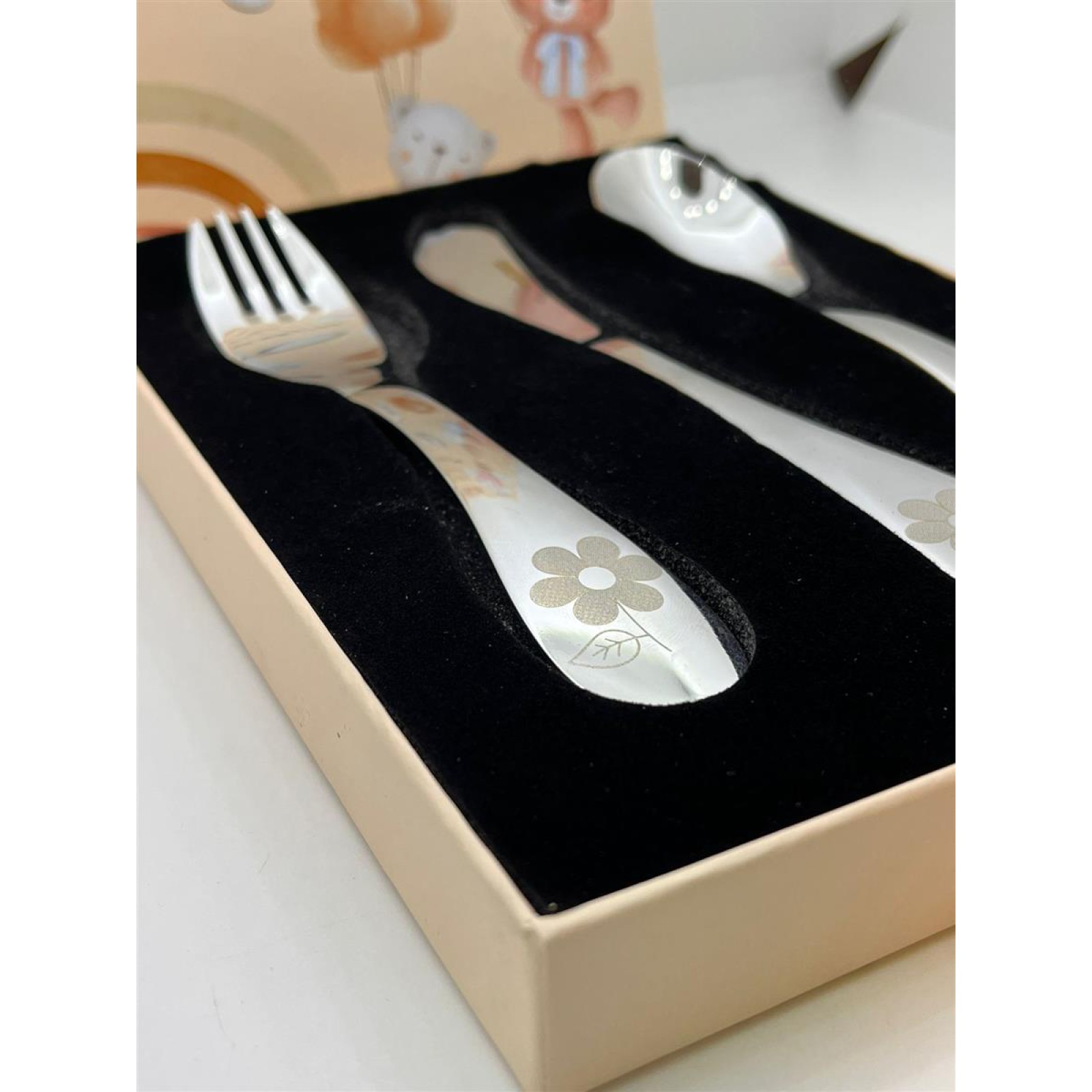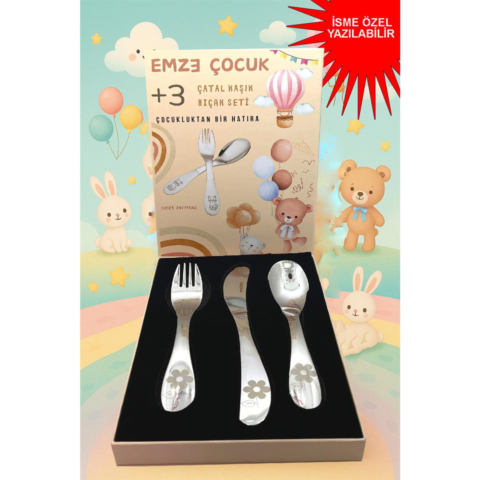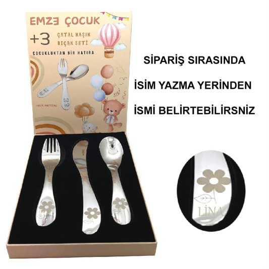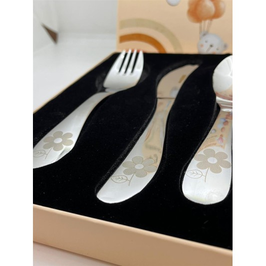 Emze Çocuk Paslanmaz Çelik Kutulu Çatal Kaşık Bıçak Seti çiçek Desenli