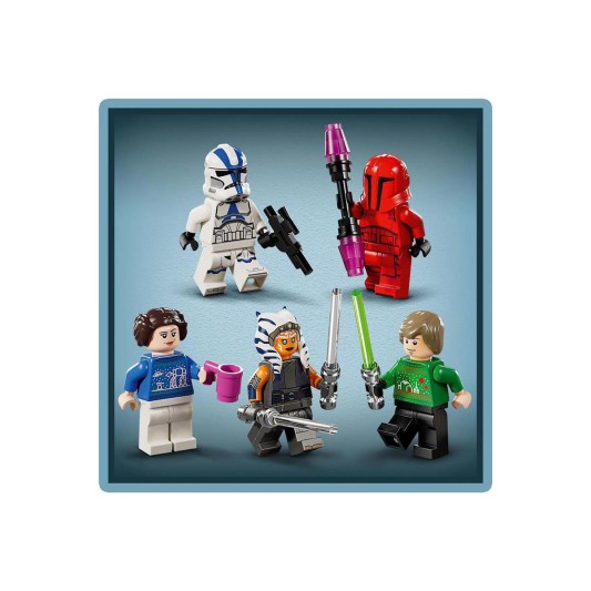 ·İkisi de yılbaşı kıyafetli Prenses Leia ile Luke Skywalker ve Ahsoka Tano dahil 5 LEGO Star Wars koleksiyonluk minifigürünün yanı sıra bir Süper Savaş Droidi LEGO figürü bulacaksınız