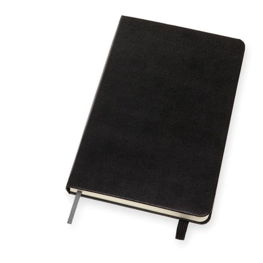 ·Moleskine Medium Black Sketchbook, kartonla ciltlenmiştir, köşeleri yuvarlatılmış bir 'moleskine' kapağı ve elastik bir muhafazası vardır.