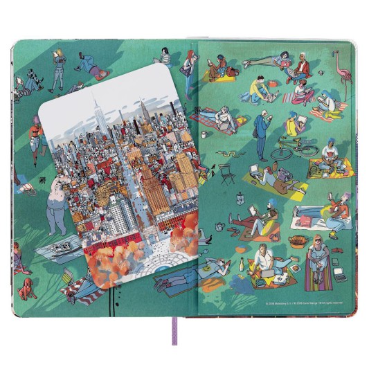 ·Bu not defterleri, kapakta ve sayfa altlarında yer alan karmaşık ve renkli Carlo Stanga çizimleriyle Londra, Milano ve New York'a saygı duruşunda bulunuyor.
