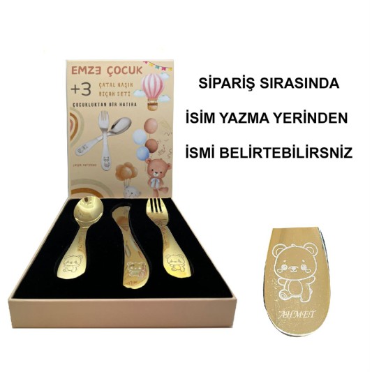 Paslanmaz Çelik Kutulu Titanyum Kaplama Çocuk Çatal Kaşık Bıçak Seti Ayıcık Desenli
