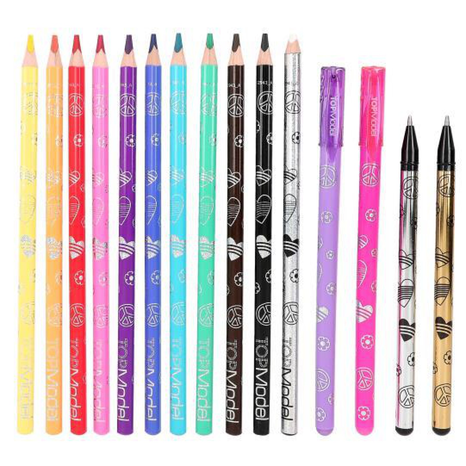 2 çıkartma sayfası ve tasarım için gerekli kalemleri (10 renkli kalem, 4 jel kalem (altın, gümüş, pembe, mor), 1 silgi kalemi) içerir.
