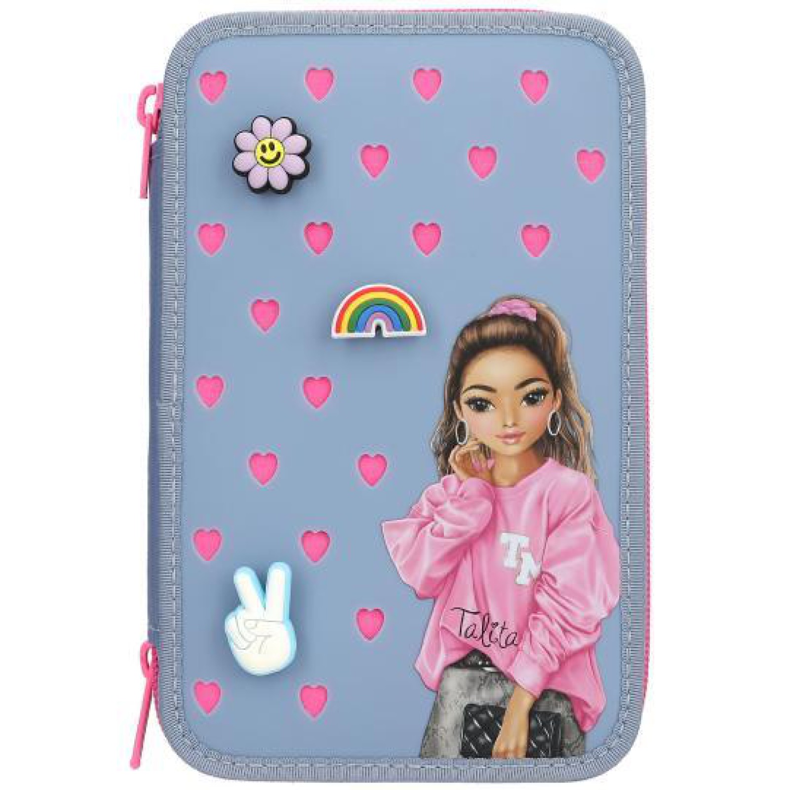 İğne gücü! TOPModel'in bu orta boy mavi kalem kutusunun ön yüzü, iğne takmak için kalp şeklinde deliklerle kaplıdır.