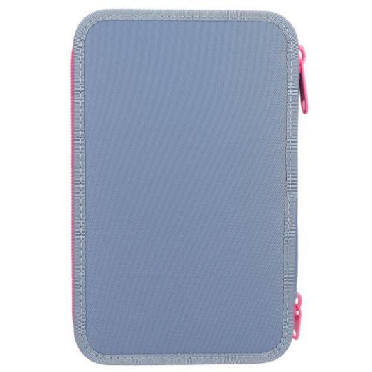Üç ayrı fermuarlı bölme, 18 renkli kalem, 18 keçeli kalem, 2 kurşun kalem, bir kalemtıraş, bir silgi, bir cetvel, bir yapıştırıcı, makas ve cırt cırtlı küçük bir cep ile tamamen doludur.